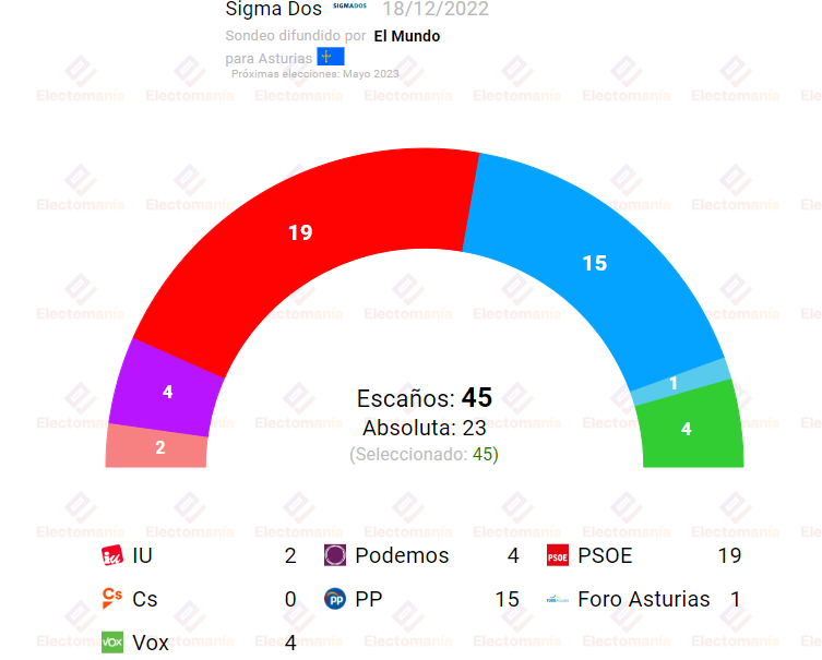 Las elecciones se acercan y empezamos la semana con dos encuestas, una de Asturias y otra de su capital, Oviedo, elaboradas por Sigma Dos, para el Mundo y recogidas por Electomanía.