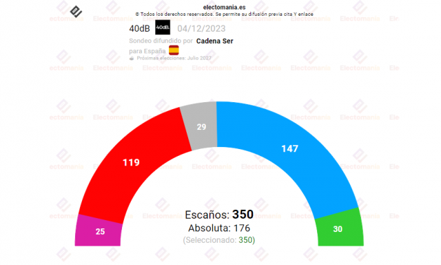 Vox bajaría hasta los 30 escaños, de los 33 actuales que tiene, Sumar se quedaría con 25 representantes. El PP repetiría como ganador de las elecciones con 147 diputados y Sánchez se quedaría con 119.