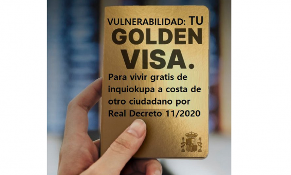 "Vulnerabilidad: tu Golden Visa para vivir gratis de inquiokupa a costa de otro ciudadano por Real Decreto 11/2020". En una sola frase la Plataforma resume a la perfección la situación por la que atraviesa España.