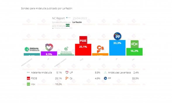 Hoy La Razón publica una encuesta de NC Report según la cual el PP obtendría el 33,3% y 45/47 escaños. El PSOE sacaría el 25,1% y 31/33 escaños. Vox conseguiría el 16,2% y 17/18 asientos. Unidas Podemos se haría con el 8,9% y 9/10 escaños. Adelante Andalucía sacaría el 5,1% y 2/3 asientos. Mientras que Ciudadanos se haría con el 4,9% y 1/3 escaños.