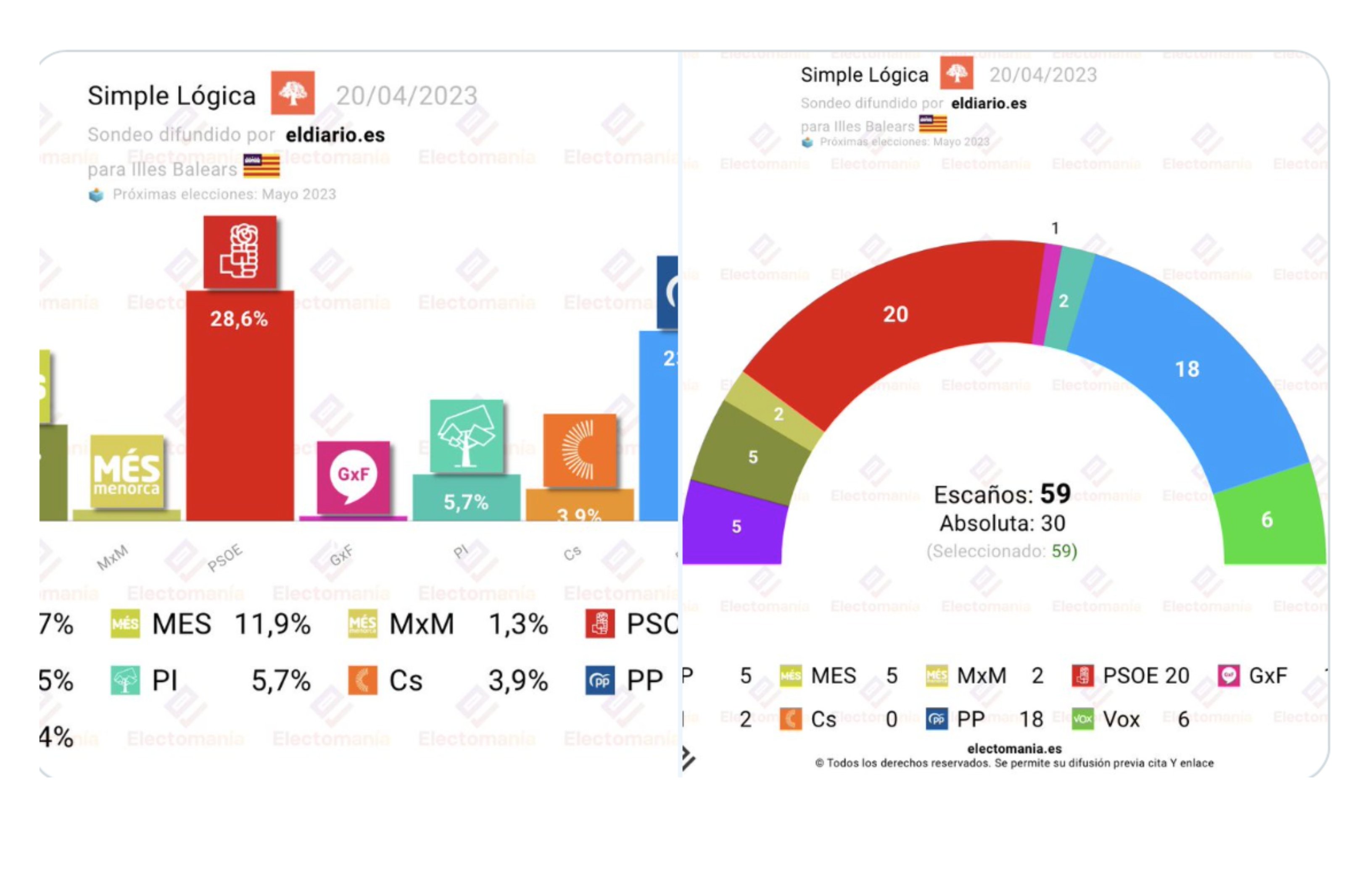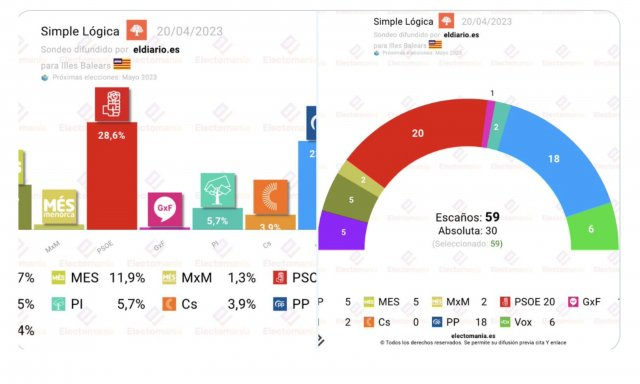 Ahora, según una encuesta de Simple Lógica para eldiario.es -recogida por Electomanía-, el PSOE obtendría 19-20 escaños. El PP 17-18. Vox 6-7. Més (Més per Mallorca) 5-6. UP 5. Proposta per les Illes (PI) 2. Més per Menorca (MxMe) 2. Y Gent per Formentera (GxF) 1.
