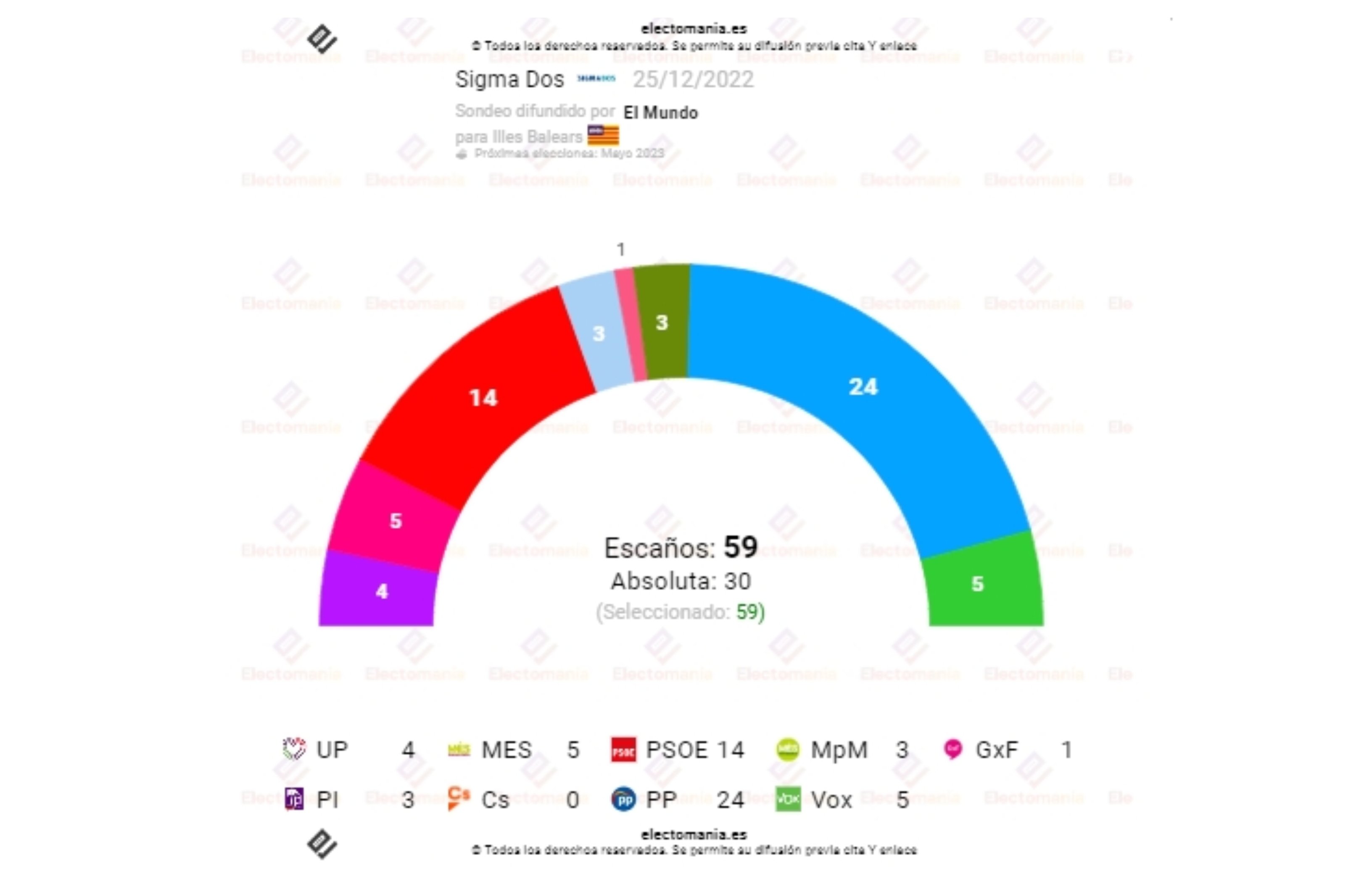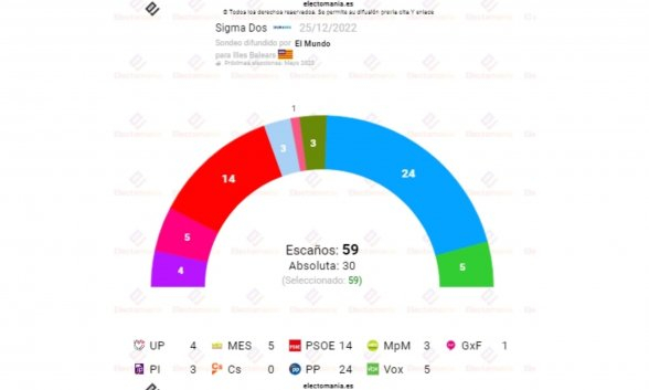 La líder socialista gobierna junto a sus socios de Unidas Podemos y los nacionalistas de Més, que, entre ambos, seguirían aglutinando en torno a un 20% del electorado. Unidas Podemos perdería dos de sus seis escaños para quedarse en cuatro. Més aumentaría de cuatro a cinco, añade El Mundo.