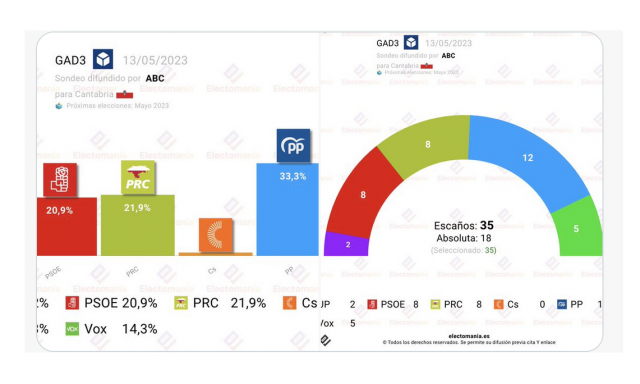 Una encuesta de Gad 3 difundida por ABC y recogida por Electomanía, da al PP 12 escaños. Al PSOE, 8. Al PRC 8. A Vox 5. Y a Unidas Podemos, 2.