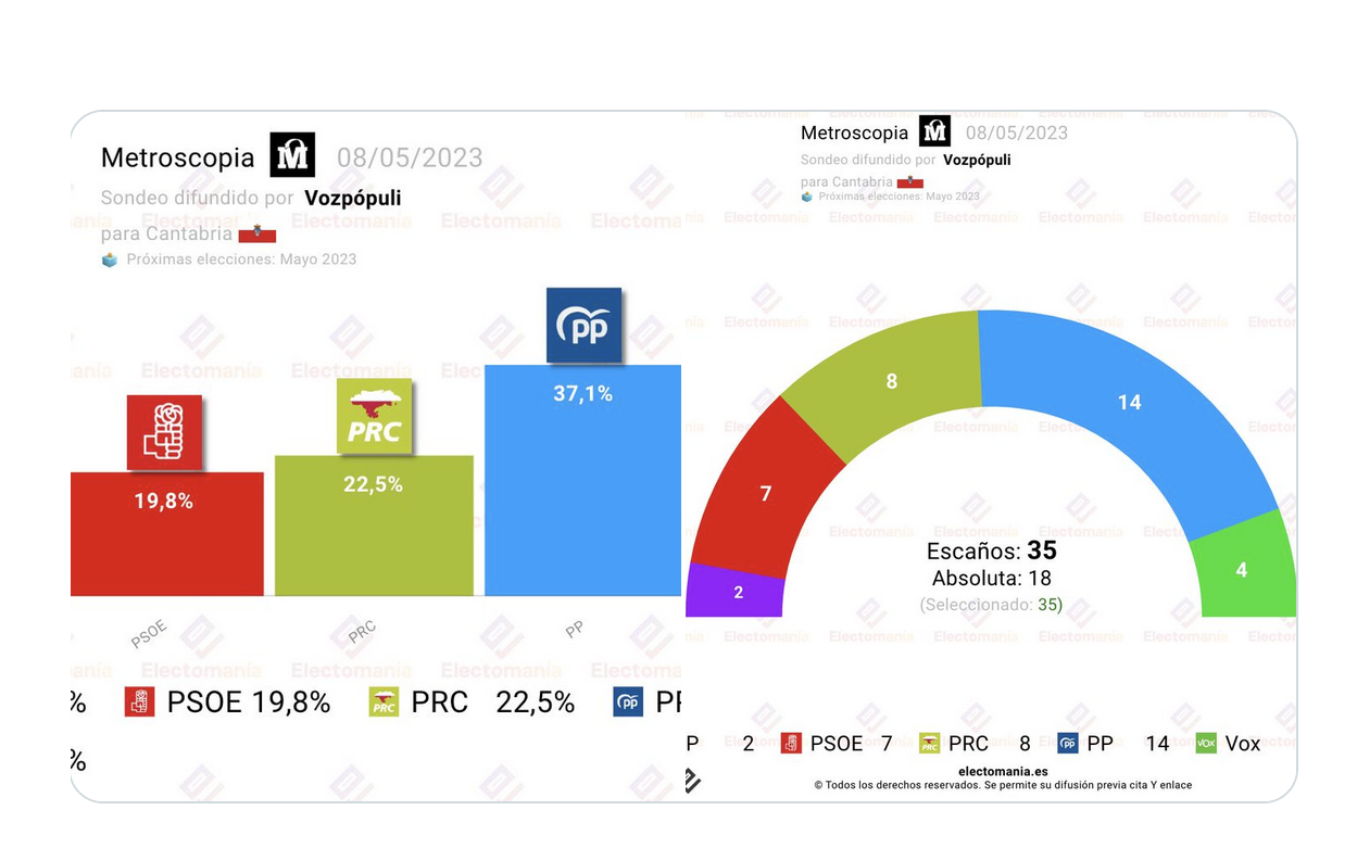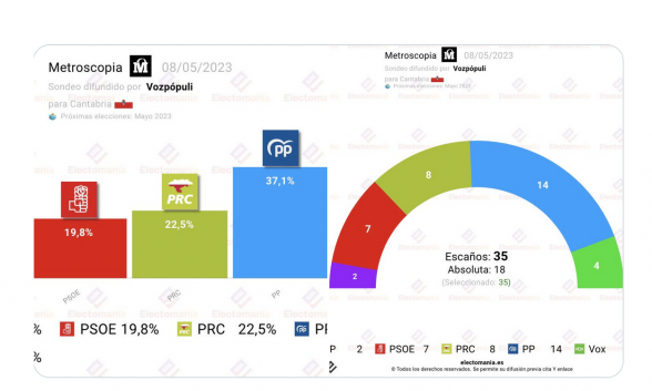 Según una encuesta de Metroscopia difundida por Voz Populi y recogida por Electomanía, el PP sacaría 14 escaños. El PRC 8. El PSOE, 7. Vox 4. Y unidas Podemos, 2.