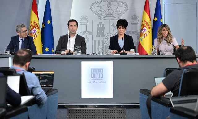 Consejo de Ministros del martes 28 de abril. Sale a escena la portavoz, Elma Saiz, con el equipo titular: vicepresidente primero, Carlos Cuerpo, vicepresidenta segunda, Yolanda Díaz y el nuevo ministro de Hacienda, Arcadi España.