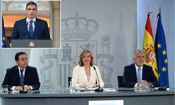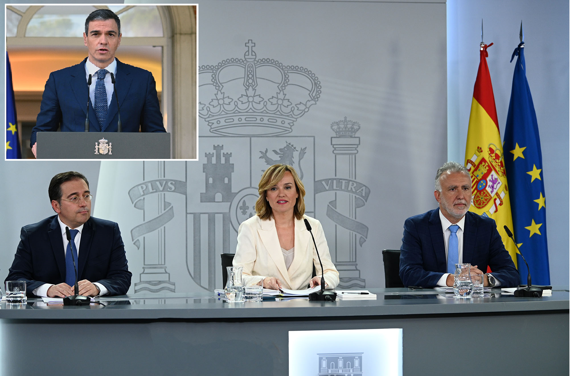 Sale a escena Pilar Alegría, teniendo a su diestra al titular de Exteriores, José Manuel Albares, que no cabía en sí de gozo, y al titular de comunidades autónomas y memoria histórica, dos temas directamente relacionados, como es sabido.