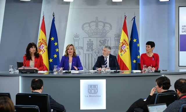 Consejo de Ministros del 8 de marzo de 2024. Extraordinario, que por eso se celebra en viernes. Salen a escena, acompañando a la ministra portavoz, un nutrido grupo de ministros: Elma Saiz, de Seguridad Social, Fernando Grande-Marlaska, de Interior y la titular de Igualdad Ana Redondo, estrella de la mañana, que ha presentado hoy 8 de marzo Día Internacional de la Mujer, el proyecto de Ley de Trata.