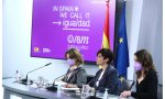 Sale acompañada de la vicepresidente Teresa Ribera y de la ministra Irene Montero, cada día más grosera con los periodistas. Las tres uniformadas con bozal morado.