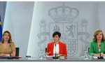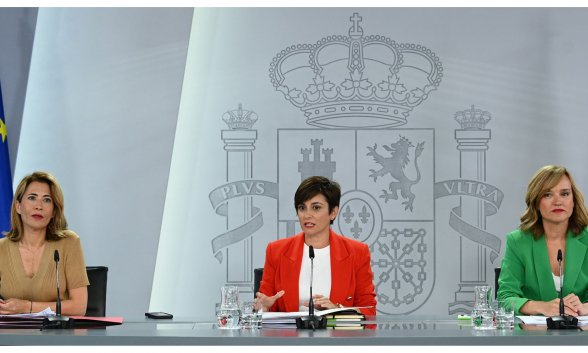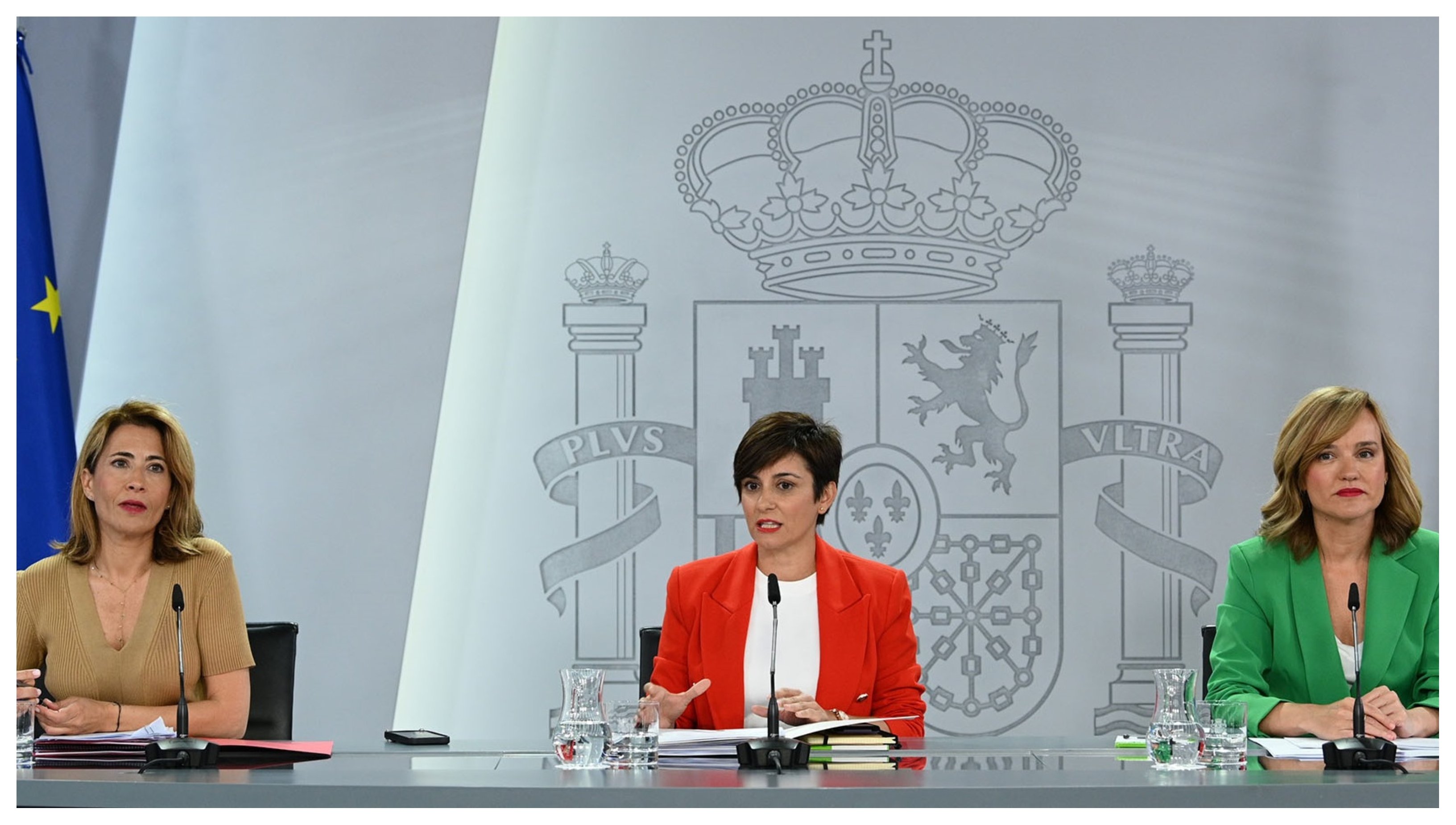 Consejo de Ministros del martes 9 de mayo. Salen a escena la ministra portavoz, Isabel Rodríguez, más tensa que nunca, acompañada de las titulares de Educación, Pilar Alegría, y de Raquel Sánchez, responsable de Vivienda.