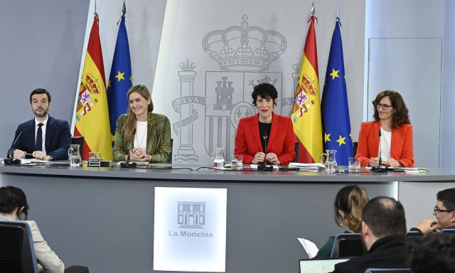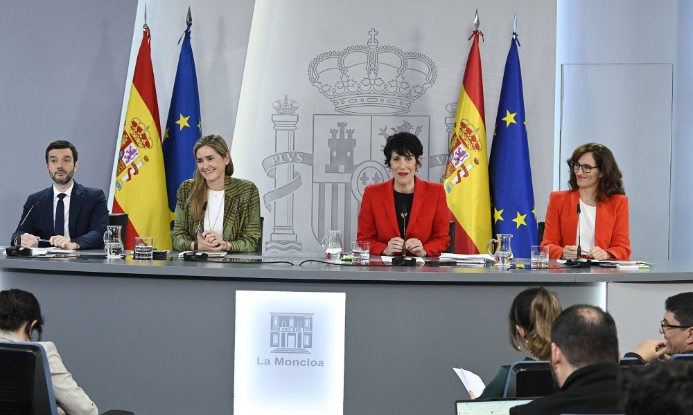 En esta ocasión aparecieron en escena la ministra portavoz, titular de Seguridad Social, Elma Saiz, flanqueada por la climática vicepresidenta, Sara Aagesen, y los sumaritas titulares de Sanidad y Asuntos sociales, Mónica García y Pablo Bustinduy.