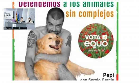Y la ministra de Asuntos Sociales presume además de contar con el único director de Bienestar Animal de Europa, Sergió García... ¿Por qué será?. Quizá por su implicación dándolo todo de sí mismo, como se puede observar en el cartel en el que pedía el voto para Equo y en el que aparece con Pepi, sin complejos... sin complejos García, queremos decir.