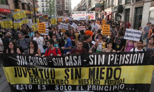 Una pancarta no refleja profundos pensamientos pero puede reflejar sentimientos profundos. La de la foto es exactamente eso. Juventud sin miedo… sí y sin curro, sin casa y sin pensión. Con los sentimientos hay que ser cautos porque pueden convertirse en convicciones.