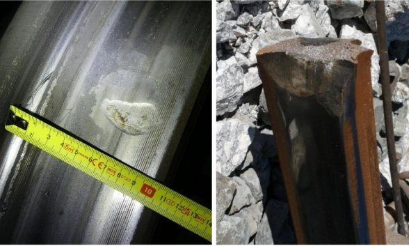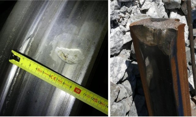 "Las muescas tienen un patrón uniforme en los coches 2, 3 y 4 y son compatibles con un impacto en la cabeza del carril. La comparación visual entre las muescas