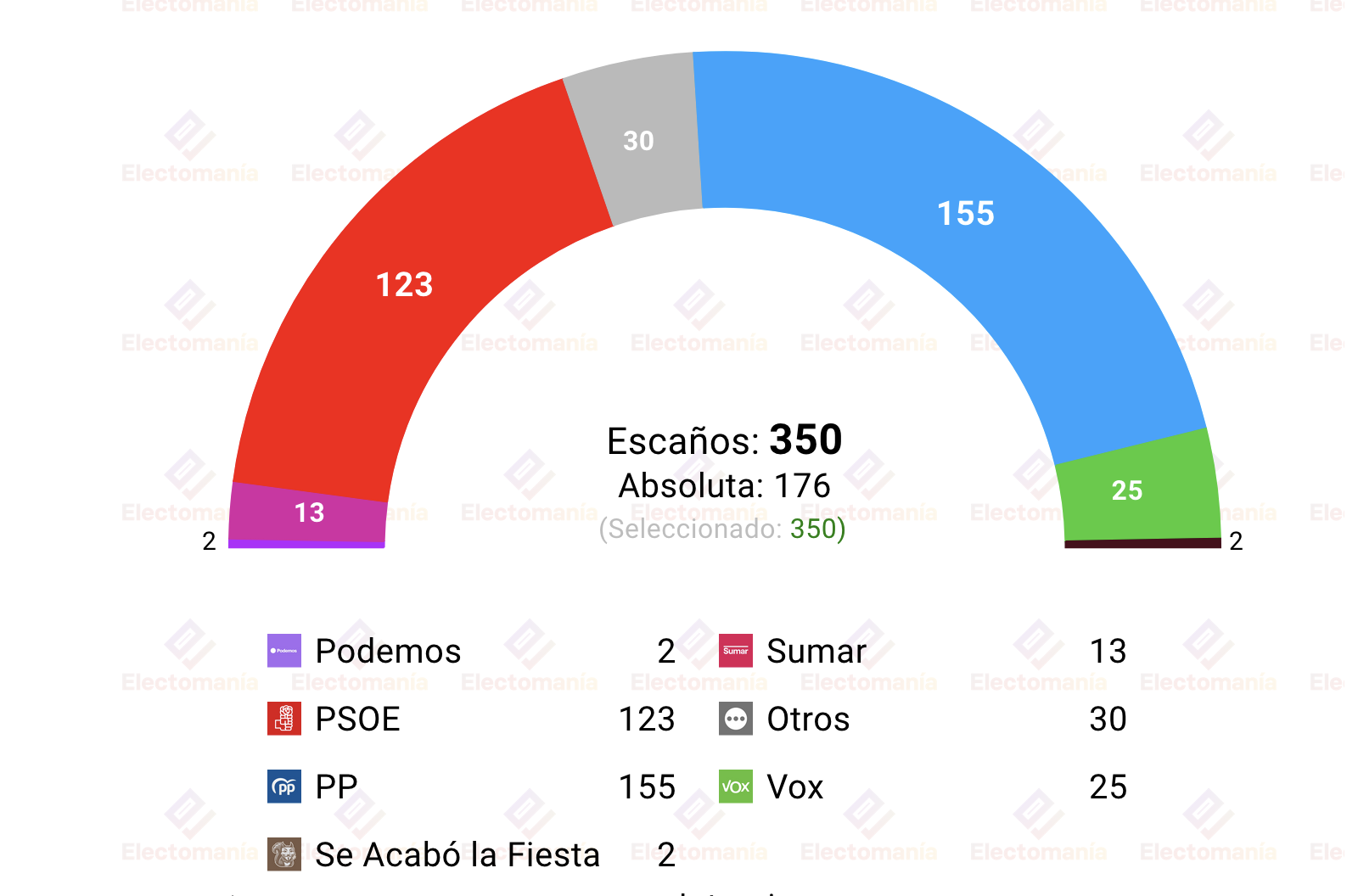 En las últimas elecciones generales de julio del año 2023, el PP obtuvo 137 escaños y el 33,05% de los votos, el PSOE se hizo con 121 escaños y el 31,70% de los votos, Vox consiguió 33 escaños y el 12,39% de los votos y Sumar se apuntó 31 escaños y el 12,31%.