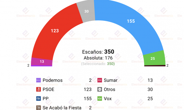 El Español publica otro sondeo de Sociométrica, recogido por Electomanía, que da al PP 156 escaños (35,2%). Al PSOE, 130 (28,3%). A Vox, 29 (11,2%). A Sumar, 10 (6,6%). Y a Se Acabó la Fiesta, 1 (3,4%).