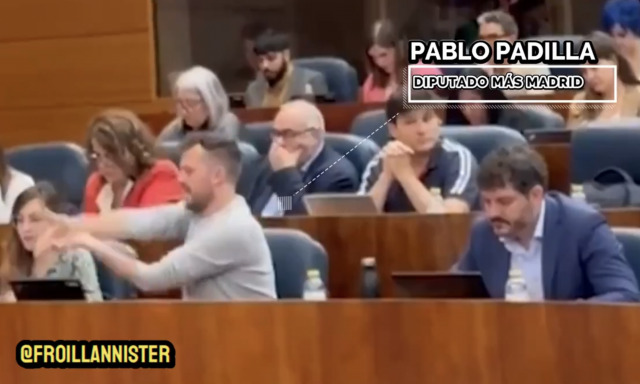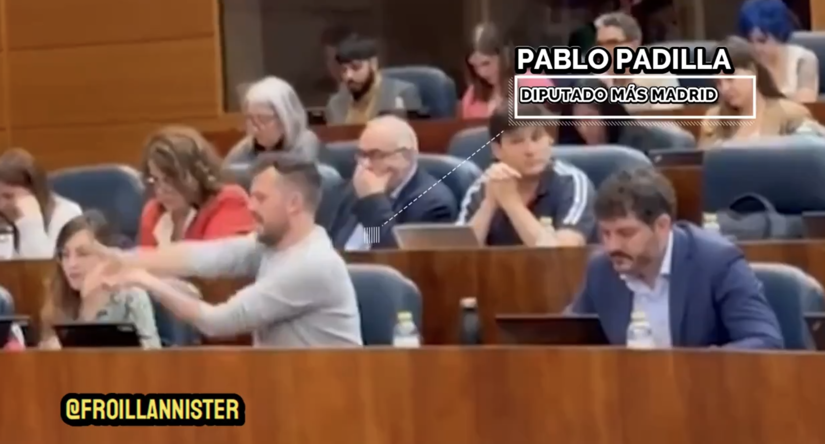 Este simpático ser es Pablo Padilla, diputado de Más Madrid por la Asamblea de Madrid, que simula una ejecución, al más puro estilo Hamás o de los amigos del tiro en la nuca, cuando está hablando Ayuso.