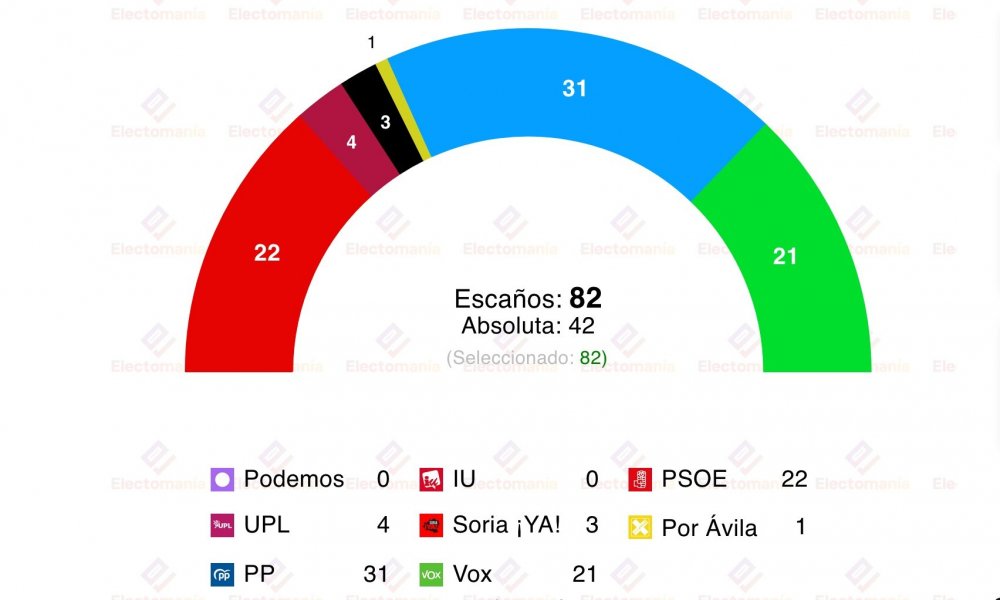 La última composición de las Cortes regionales fue la siguiente: PP 31 escaños; PSOE 28 escaños; Vox 11 escaños; UPL-SORIA ¡YA! 6 escaños; Mixto 3 escaños; No Adscritos 2 escaños.