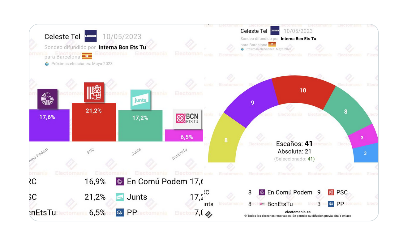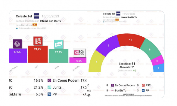 Una encuesta de Celeste Tel -un sondeo interno de la formación 'Barcelona Ets Tu'-, recogido por Electomanía, otorga al PSC diez concejales. A En Comú Podem (Ada Colau, la actual alcaldesa), 9. A ERC, 8. A Junts, 8. Al PP, 3. Y a Barcelona Ets Tu, otros 3.
