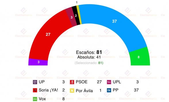 Así las cosas, el PP ganaría 6 escaños respecto a febrero de 2022 (cuando obtuvo 31). Aunque para la mayoría absoluta necesitaría otros 4 escaños, que podrían venirle o bien de Vox o bien de partidos provinciales como UPL (que tiene 3); Soria Ya, que tiene 2; y Por Ávila, que tiene 1.