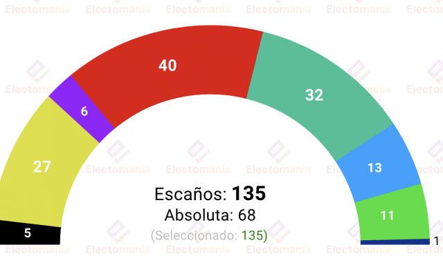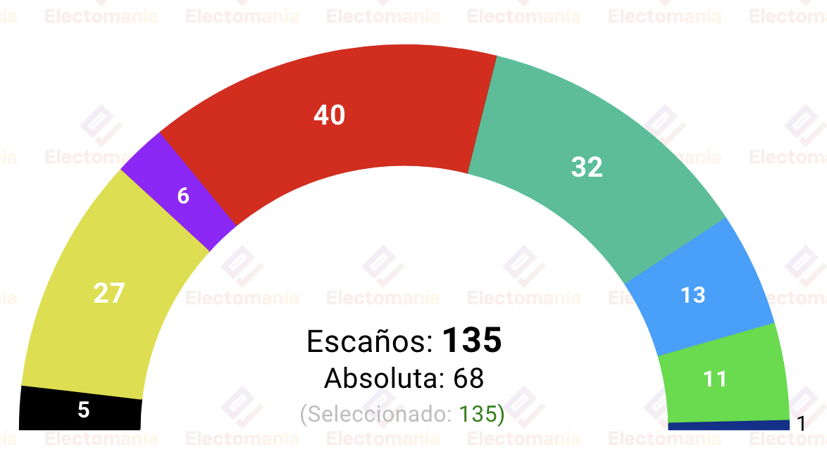 La mayoría absoluta se sitúa en los 68 escaños, de un total de 135.