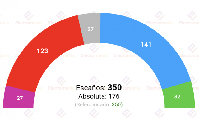 Así las cosas, la suma de PP y Vox resultaría en 173 escaños, a los que se podría sumar uno de UPN y otro de Coalición Canaria, consiguiendo 175, a tan solo uno de la mayoría absoluta.