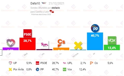 Pues bien: según la encuesta de Data10 para Ok Diario, publicada por Electomania, -y la primera tras la convocatoria de elecciones-, el Partido Popular lograría el 40,7% de los votos, lo que se traduce en 39 diputados (la mayoría está en 41). Los populares, que ahora cuentan con 29 asientos en las Cortes, ven confirmado en las urnas el aval a su gestión. Mañueco sólo precisaría así de la abstención de Vox, partido que registra un espectacular crecimiento, pasando de un diputado a 10 (12,4% de votos).