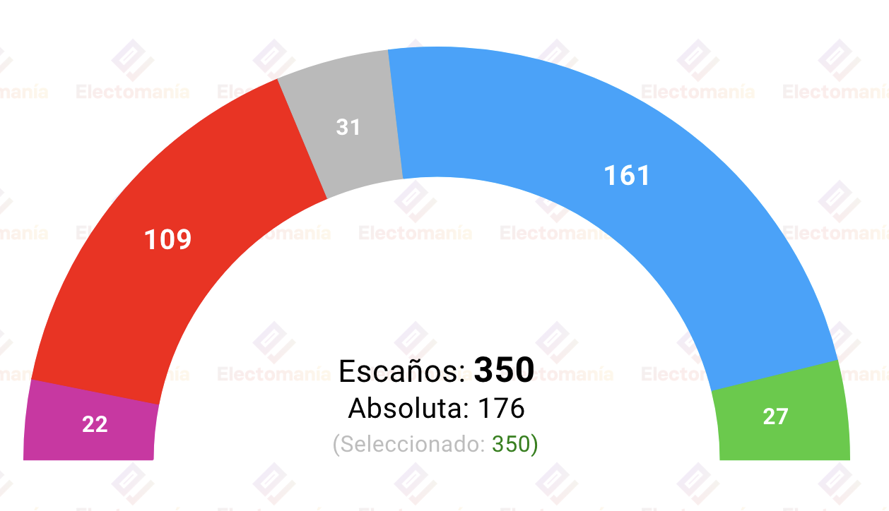 Voz Populi publica una encuesta de Hamalgama Métrica sobre las elecciones generales --recogida por Electomanía-- según la cual el PP conseguiría 161 escaños. El PSOE obtendría 109. Vox se haría con 27. Sumar se apuntaría 22. Junts 8. EH Bildu 7. ERC 7. PNV 5.