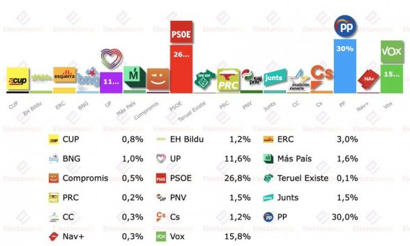 Mientras que el PSOE sacaría el 26,8% de los votos y 103 escaños.