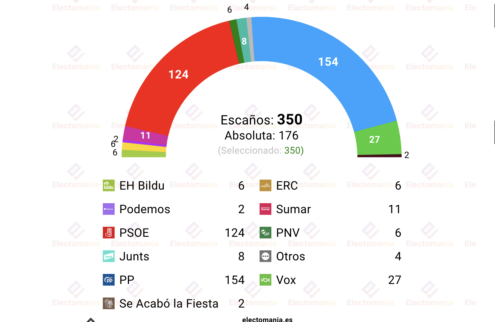 Hoy Vozpópuli publica una encuesta de Hamalgama Métrica, recogida por Electomanía, según la cual, el PP obtendría el 35,2% de los votos y 154 escaños.