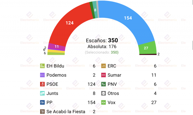 En las últimas elecciones generales de julio del año 2023, el PP obtuvo 137 escaños y el 33,05% de los votos, el PSOE se hizo con 121 escaños y el 31,70% de los votos, Vox consiguió 33 escaños y el 12,39% de los votos y Sumar se apuntó 31 escaños y el 12,31%.