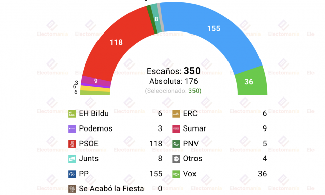 En las últimas elecciones generales de julio del año 2023, el PP obtuvo 137 escaños y el 33,05% de los votos, el PSOE se hizo con 121 escaños y el 31,70% de los votos, Vox consiguió 33 escaños y el 12,39% de los votos y Sumar se apuntó 31 escaños y el 12,31%.