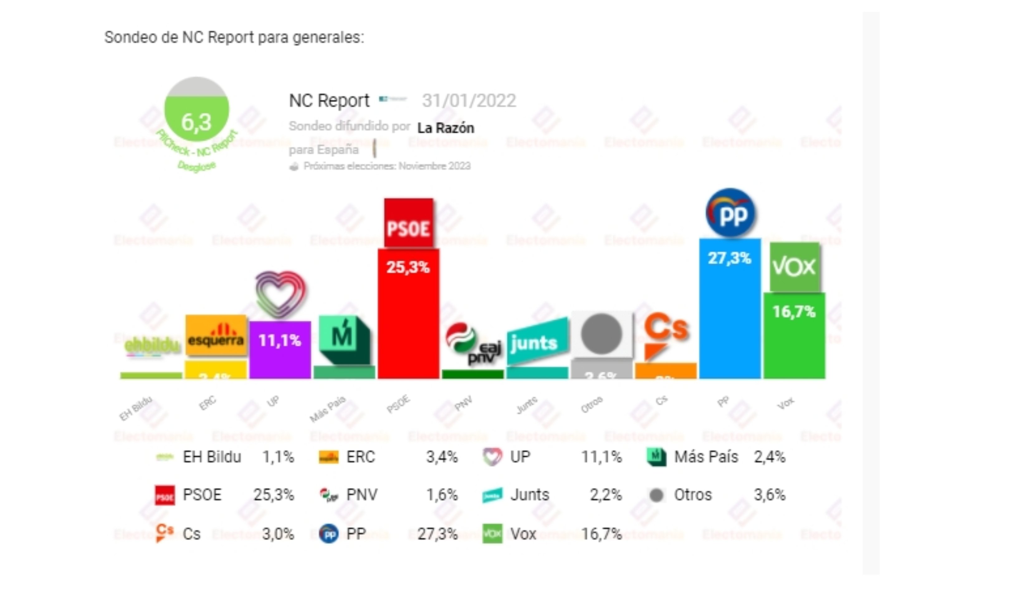 Una encuesta de NC Report publicada este lunes por La Razón -y recogida por Electomania- otorga al PP el 27,3% de los votos y 115-117 escaños.