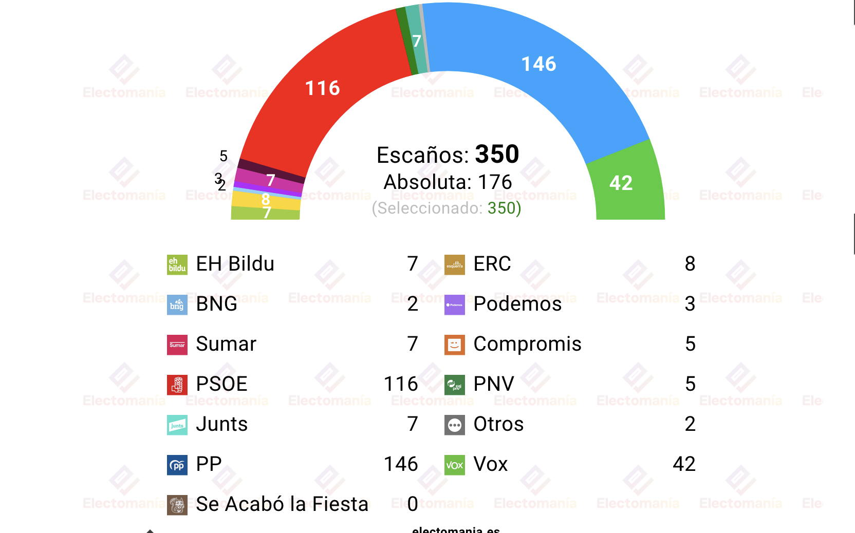 En las últimas elecciones generales de julio de 2023, el PP obtuvo 137 escaños y el 33,05% de los votos, el PSOE se hizo con 121 escaños y el 31,70% de los votos, Vox consiguió 33 escaños y el 12,39% de los votos y Sumar se apuntó 31 escaños y el 12,31%.