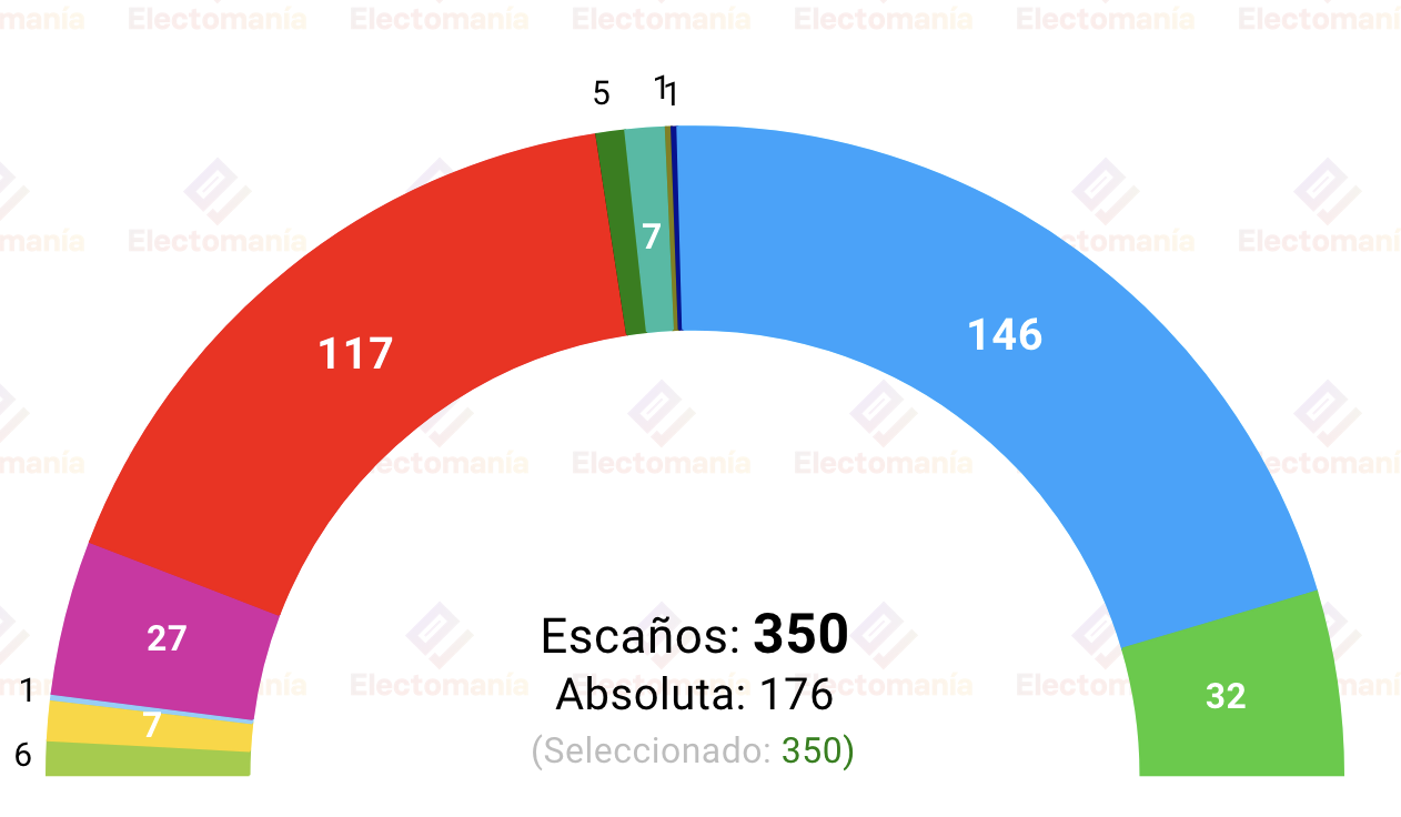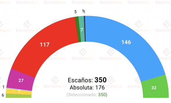 Así las cosas, la suma de PP y Vox conseguiría una mayoría absoluta de 178 escaños...