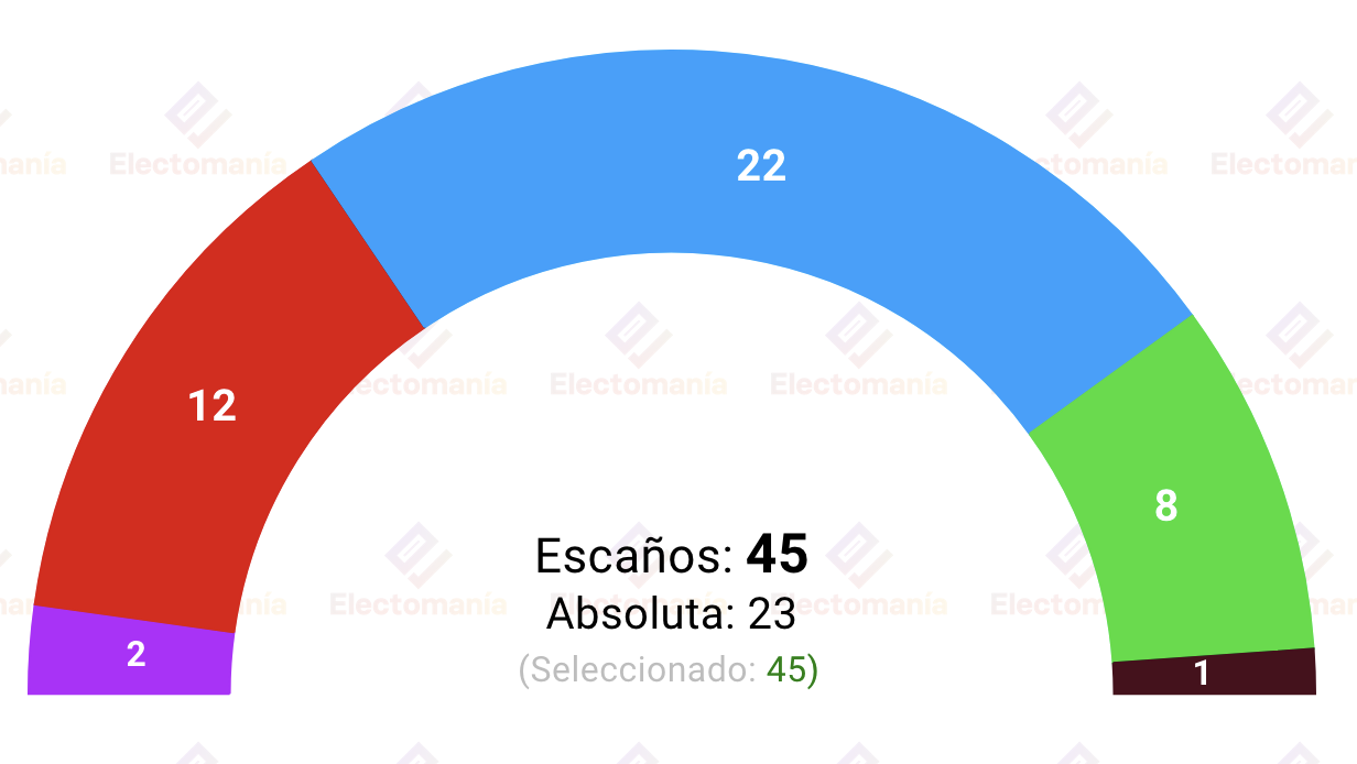 En las últimas elecciones regionales de mayo de 2023, el PP obtuvo 21 diputados. El PSOE, 13. Vox, 9. Y Podemos+IU+AV se hizo con 2.