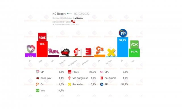 Para La Razón, basándose en una encuesta de NC-Report -recogida por Electomania- "El PP consigue entre 34 y 37 escaños (34,7%) y el PSOE baja a 26/28 (28%). Así mismo da entre 10 y 11 a Vox (14,7%); 2 o 3 a Unidas Podemos (6,5%), mientras que Ciudadanos lograría un representante (4,3%). La encuesta de NC-Report daría entre 1 y 2 a Soria Ya! y entre 2 y 3 a Unión del Pueblo Leonés.