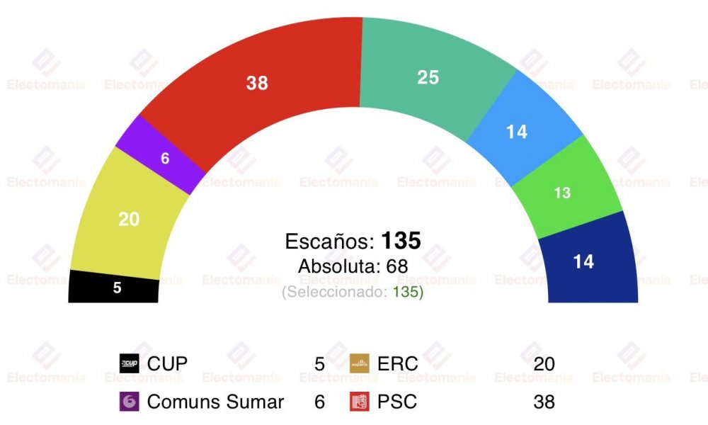 Poco más de un año lleva Cataluña con su Gobierno, salido de las urnas el 12 de mayo de 2024. La mayoría absoluta se sitúa en los 68 escaños, de un total de 135. El PSOE-PSC obtuvo 42 escaños. ERC 20 escaños. Junts 35. Vox 11. CUP 4. En Comú Podem 6. PP 15 y Alianza Catalana 2.