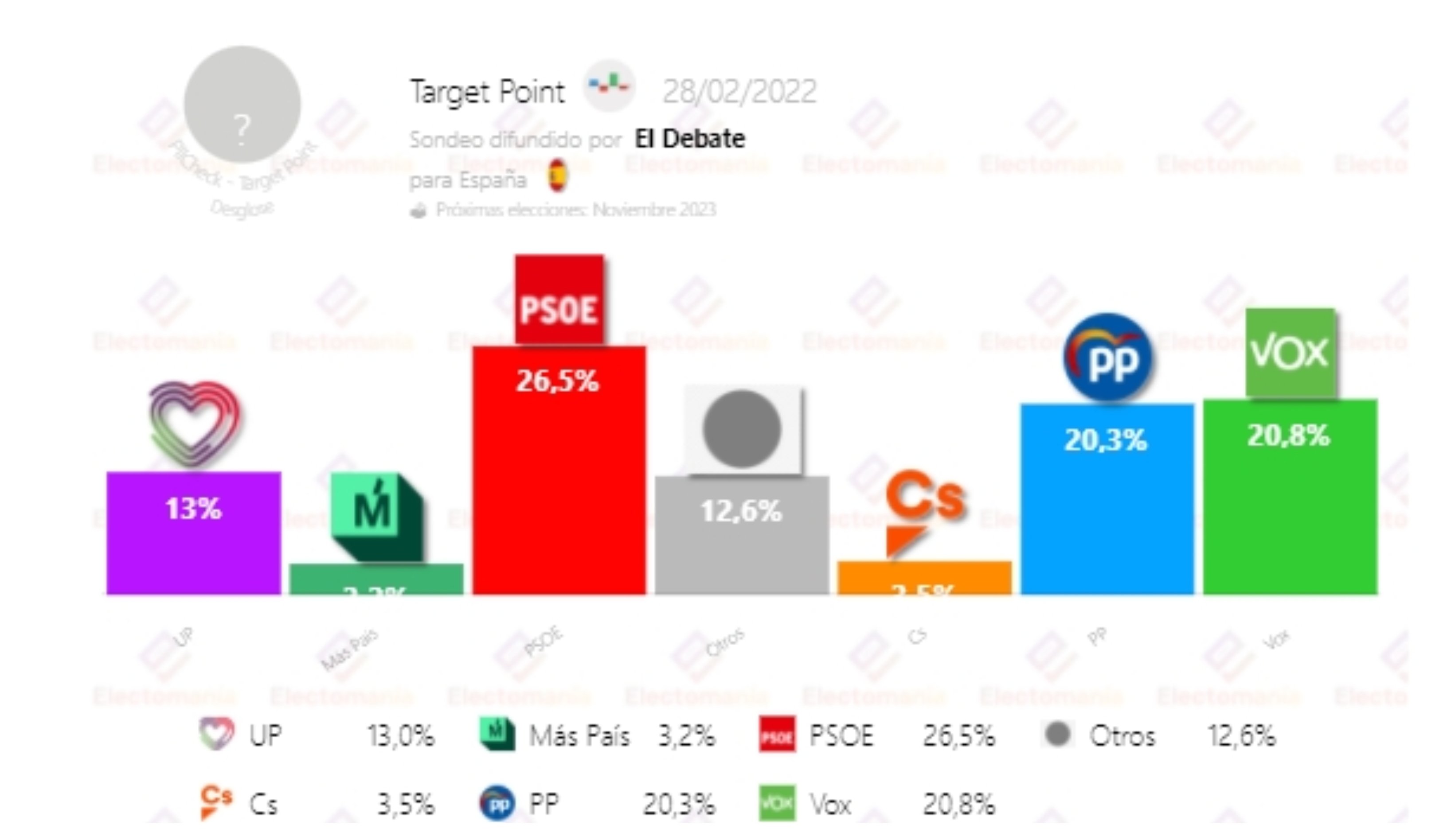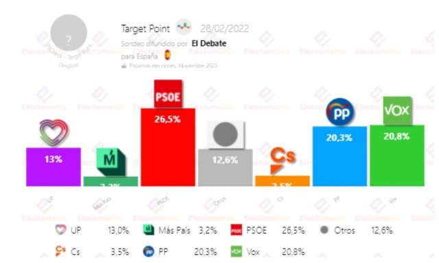 Por su parte, El Debate ha publicado otra encuesta de Target Point -recogida por Electomania- según la cual, el PSOE ganaría las elecciones con el 26,5% de los votos y 107 escaños.