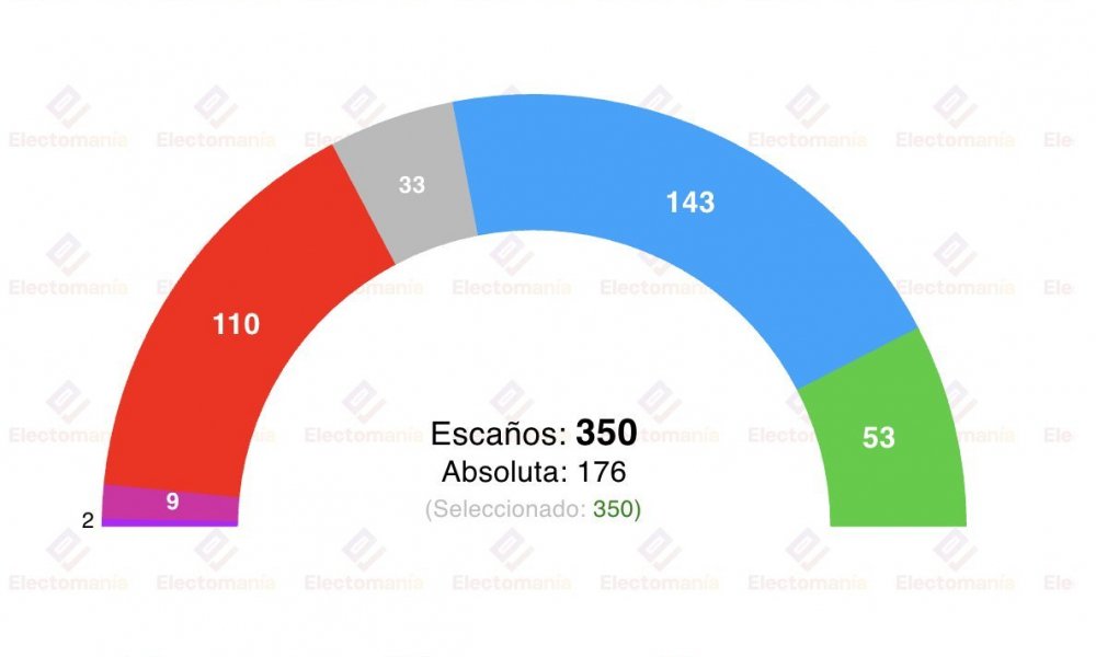 El sondeo le da Feijóo el 33,4% y 141-145 asientos en el Congreso. El resultado de Vox sigue su línea ascendente, con un 16,2% y 52-55 escaños, de los 33 actuales que tiene, y se afianza como tercera fuerza política. Sumar perdería apoyos y conseguiría 9-10 representantes, de los 31 que posee ahora mismo, al igual que Podemos, que bajaría al 4% con 2-3 sillones. El PP repetiría como ganador de las elecciones y Sánchez se quedaría con 109-112 escaños y el 27,3% de los votos, resultado por debajo del de julio, cuando obtuvo 121 escaños.