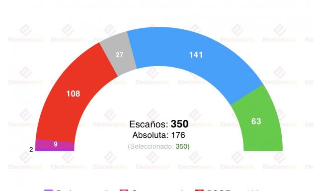 Por el lado de la derecha, tenemos al PP recuperándose en el 30,9%, pero bajando desde los 137 escaños a los 130 que le estima el sondeo. En cuanto a Vox, alcalzarían el 18,3% y los 64 diputados.