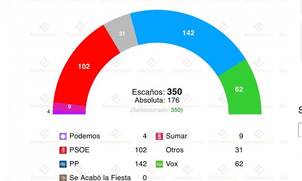 El 23 de julio de 2023, en las últimas elecciones generales celebradas en España, el PP obtuvo el 33,05% de los votos y 136 escaños.
