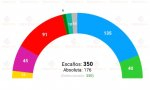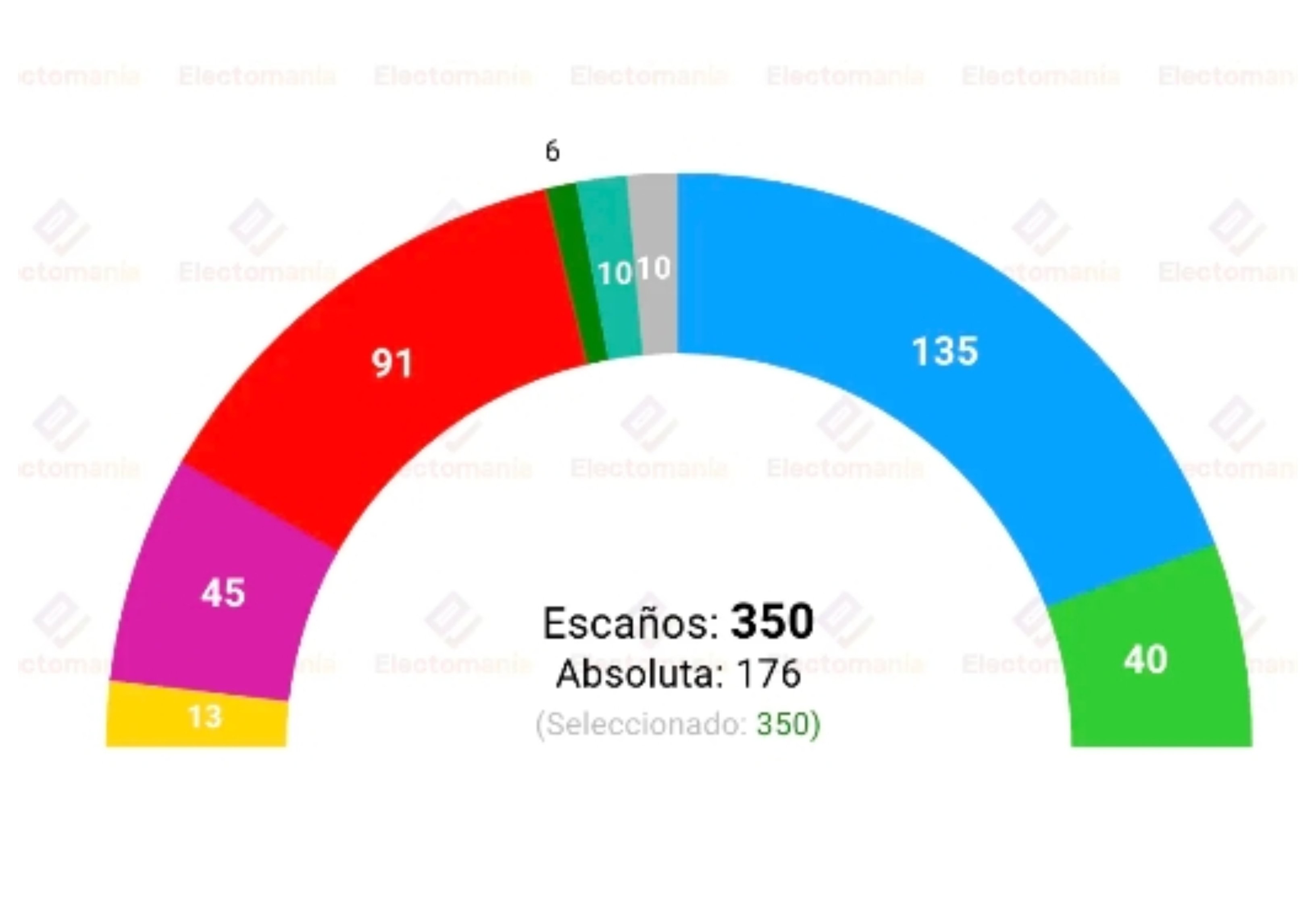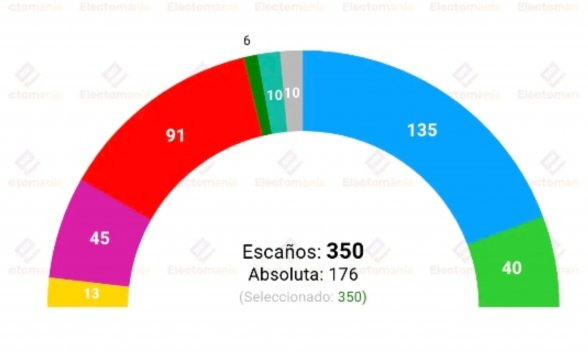 Primero, como siempre, recordemos los resultados de las últimas elecciones generales celebradas el 10 de noviembre de 2019: el PSOE sacó 120 escaños y el 28% de los votos. El PP, 89 y el 20,8%. Vox, 52 y el 15,1%. Podemos, 35 y el 12,8%. Y Ciudadanos, 10 y el 6,8%. La mayoría absoluta, recordemos, se sitúa en los 176 escaños.