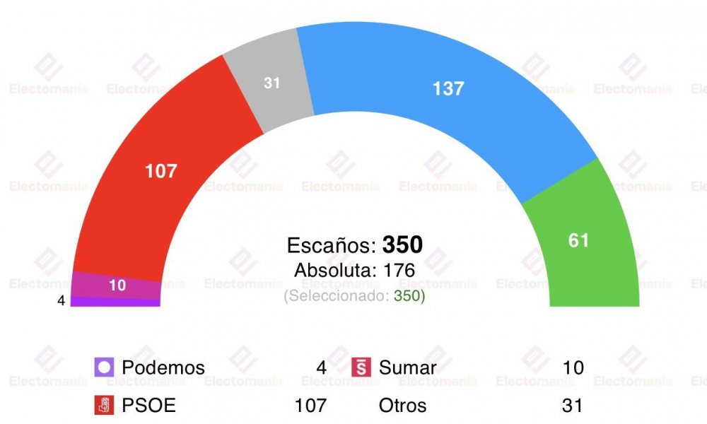 Seguimos con los resultados de Hamalgama Métrica, de los que se hace eco Electomanía, "PP y Vox en 206 escaños", Vozpópuli directamente señala a una pérdida imparable de votos por el lado de la izquierda, con un PSOE en los 106 escaños, Sumar con 7 y Podemos con 4. PP y Vox aprovechan esta situación con 153 para los de Feijóo y 54 para los de Abascal.