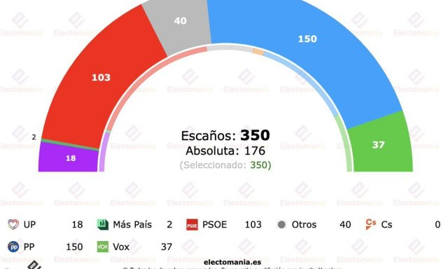 Una encuesta de Nius Diario recogida por Electomanía concluye que el Partido Popular ganaría las elecciones con un 34,8% de los votos y entre 148 y 152 escaños.
