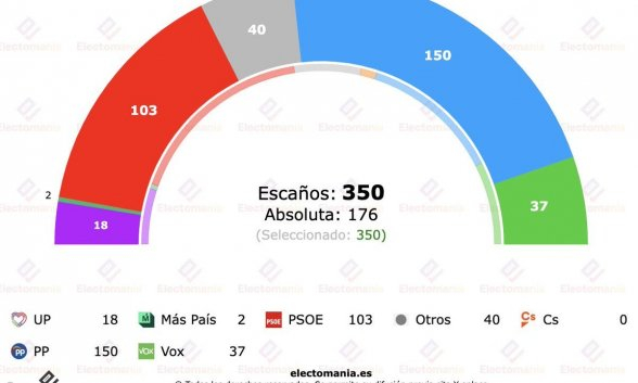 Primero, como siempre, recordemos los resultados de las últimas elecciones generales celebradas el 10 de noviembre de 2019: el PSOE sacó 120 escaños y el 28% de los votos. El PP, 89 y el 20,8%. Vox, 52 y el 15,1%. Podemos, 35 y el 12,8%. Y Ciudadanos, 10 y el 6,8%. La mayoría absoluta, recordemos, se sitúa en los 176 escaños.