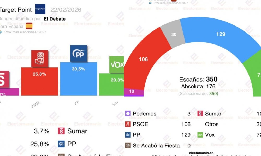 Hoy lunes 23 de febrero un nuevo sondeo aviva la teoría mayoritaria: estamos ante el fin del Sanchismo. "Vox a menos de 6p del PSOE", según los datos recogidos por Target Point para El Debate, disponibles en Electomanía.