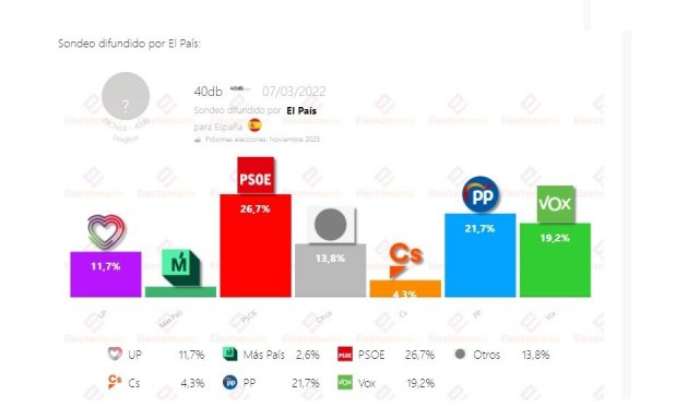 Un sondeo de 40db publicado en El País otorga el 26,7% de los votos y 109 escaños al PSOE. El PP obtendría el 21,7% de los votos y 92 escaños. Vox sacaría el 19,2% de los votos y 69 escaños. Unidas Podemos se haría con el 11,7% y 32 escaños. Ciudadanos sacaría el 4,3% y 3 escaños. Y Más País se haría con el 2,6% y 3 diputados.