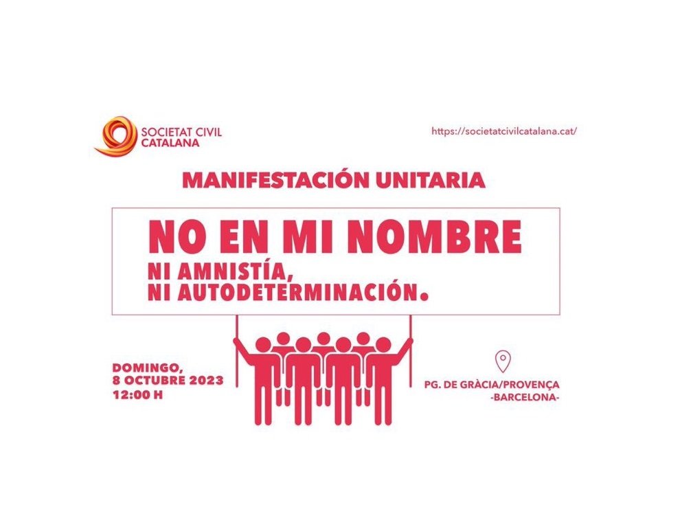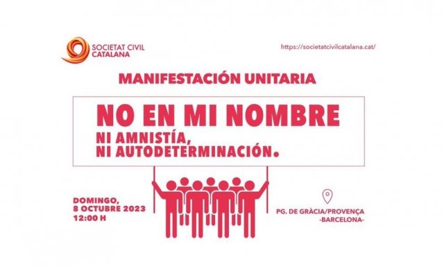 Este domingo 8 de octubre se celebrará una manifestación en Barcelona, convocada por Sociedad Civil Catalana, bajo el lema: "No en mi nombre. Ni amnistía ni autodeterminación".