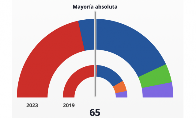 En la cita con las urnas de este 28-M el PSOE ha sacado 28 escaños, los mismos que el PP. Vox se ha hecho con 5. Y Podemos con 4.
