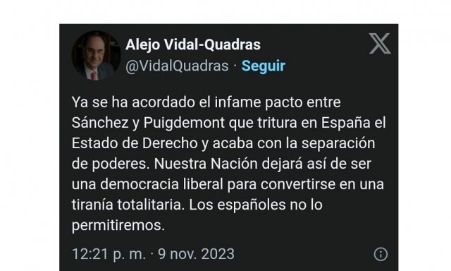 Una broma del destino: 50 minutos antes de que le dispararan, Vidal-Quadras aseguraba que el acuerdo PSOE-Junts termina con el estado de derecho y nos convierte en una "tiranía totalitaria". A continuación le pegaban una balazo en la cara.